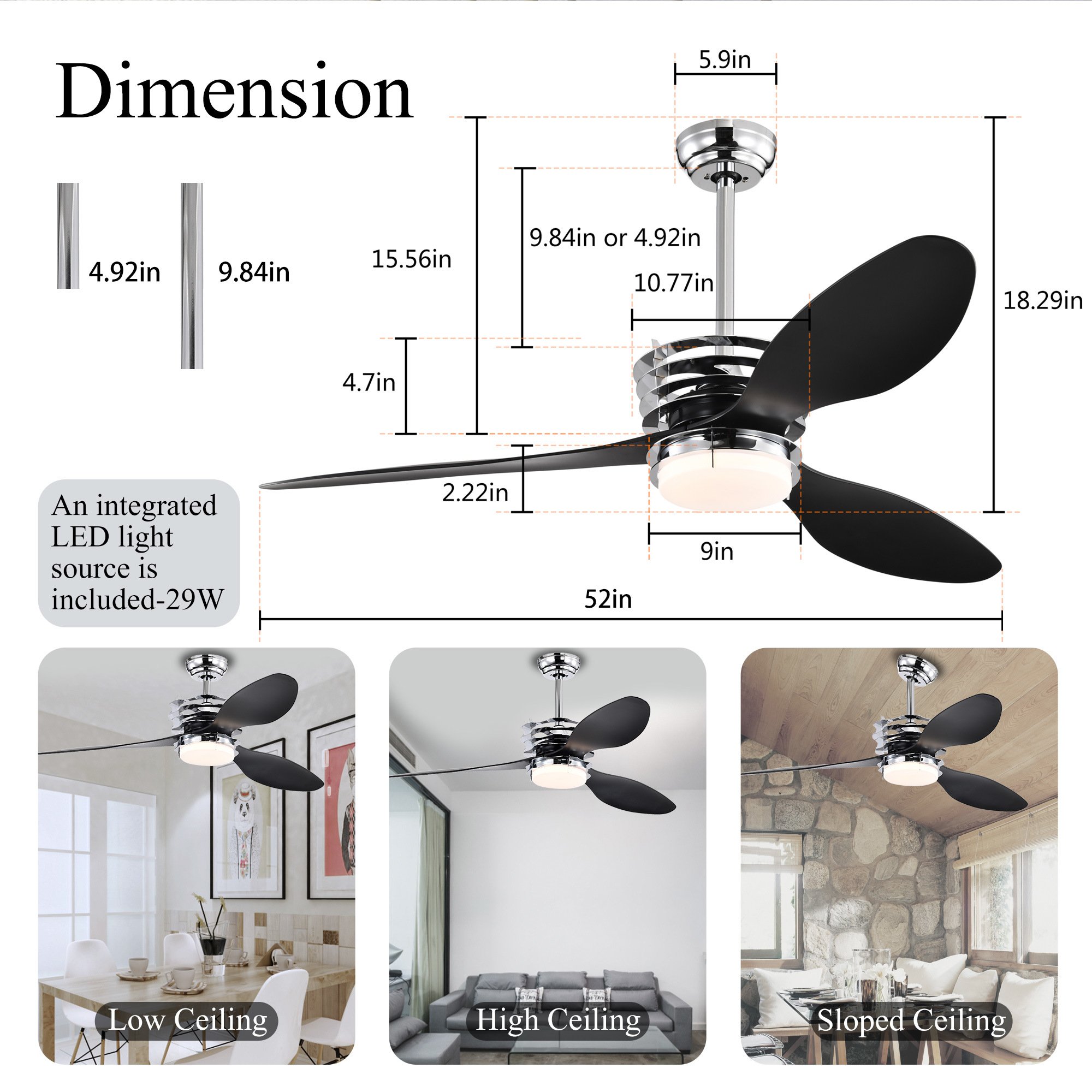 EASY INSTALLATION: With a 52-inch blade span, this ceiling fan is perfect for circulating the air in a bedroom or home office. 4.9" and 9.8" downrod included. Compatible with sloped ceilings up to 15 degrees. Designed for use in damp locations only.
