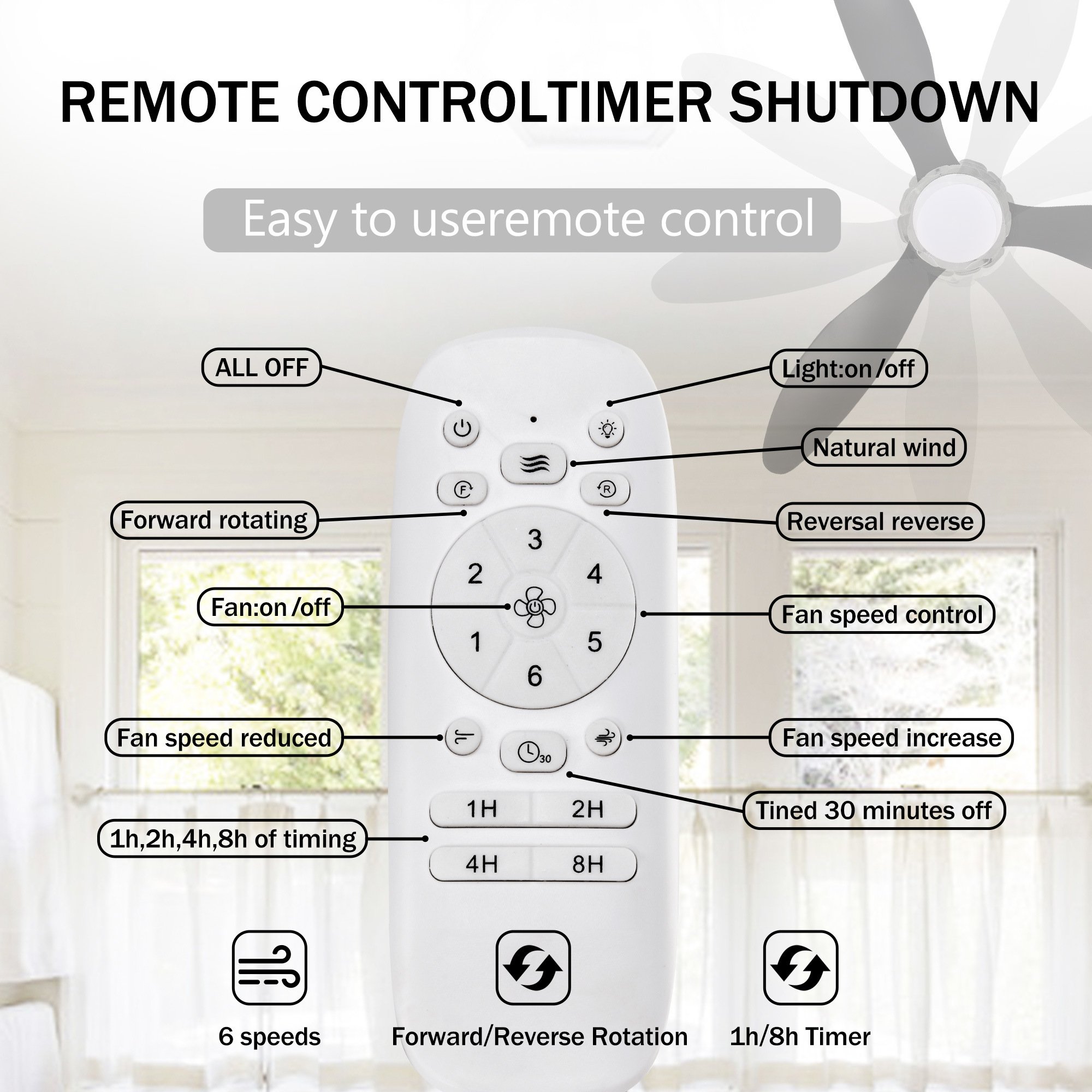 6 SPEEDS DUAL-DIRECTION FAN: A stylish 5 speed remote control is included as standard and offers fan reversing, natural breeze mode, energy-efficient 1, 2, 4 and 8-hour timer. LED LIGHT KIT & DC MOTOR: An integrated LED light source is included (18W, 3000K/4500K/6000K). You can use the fan with or without the light. The fan features an energy-efficient DC motor for cost efficiency savings and has convenient wall holder for remote storage. They save up to 65% more efficient than traditional AC fa
