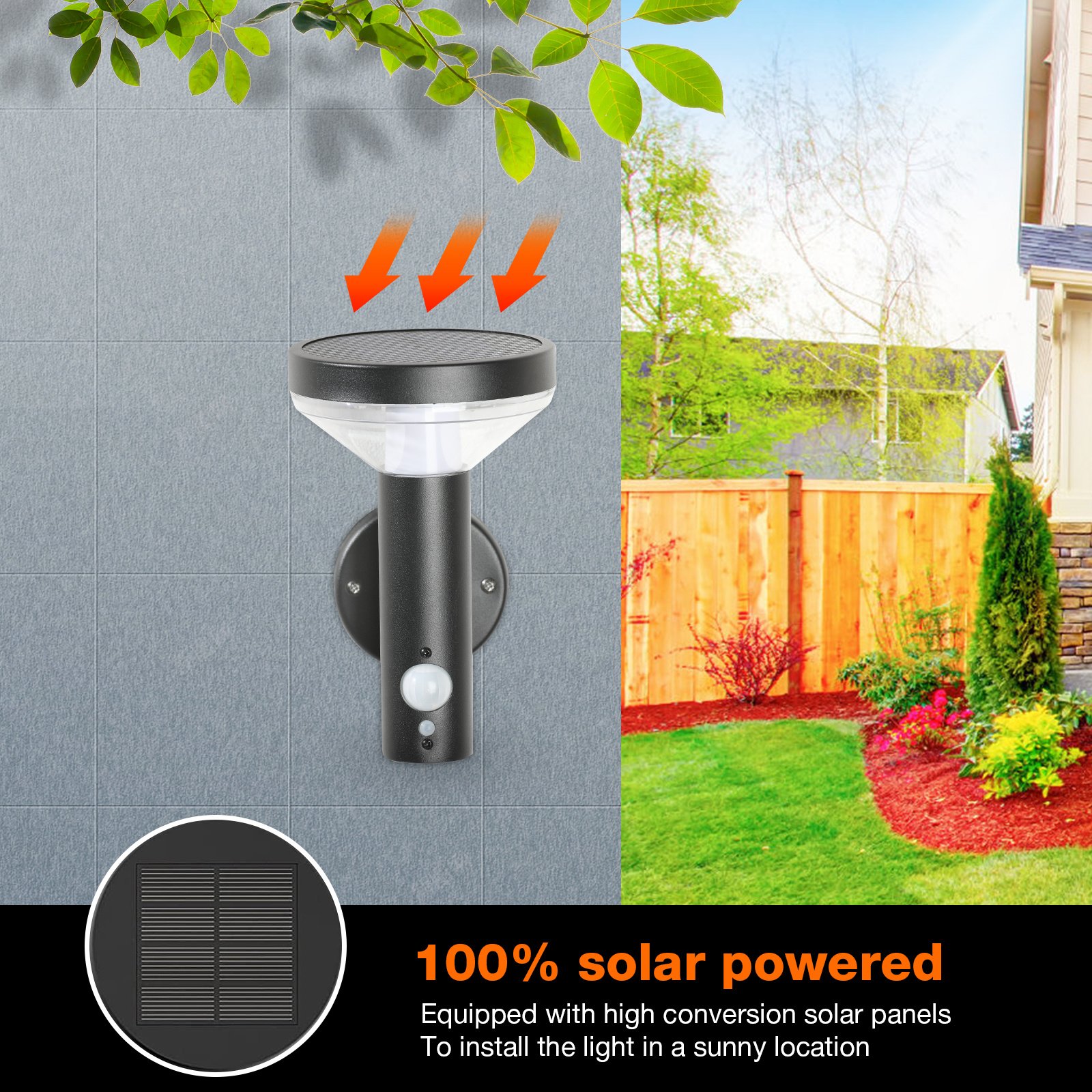 2.Dusk to dawn motion sensor: solar lights outdoor works auto at night. Solar wall lantern with 3 mode. a. Sensor turns on when detects move. b.Glow all night in low lumens. c. Light glow all night and become brighter when detects move.