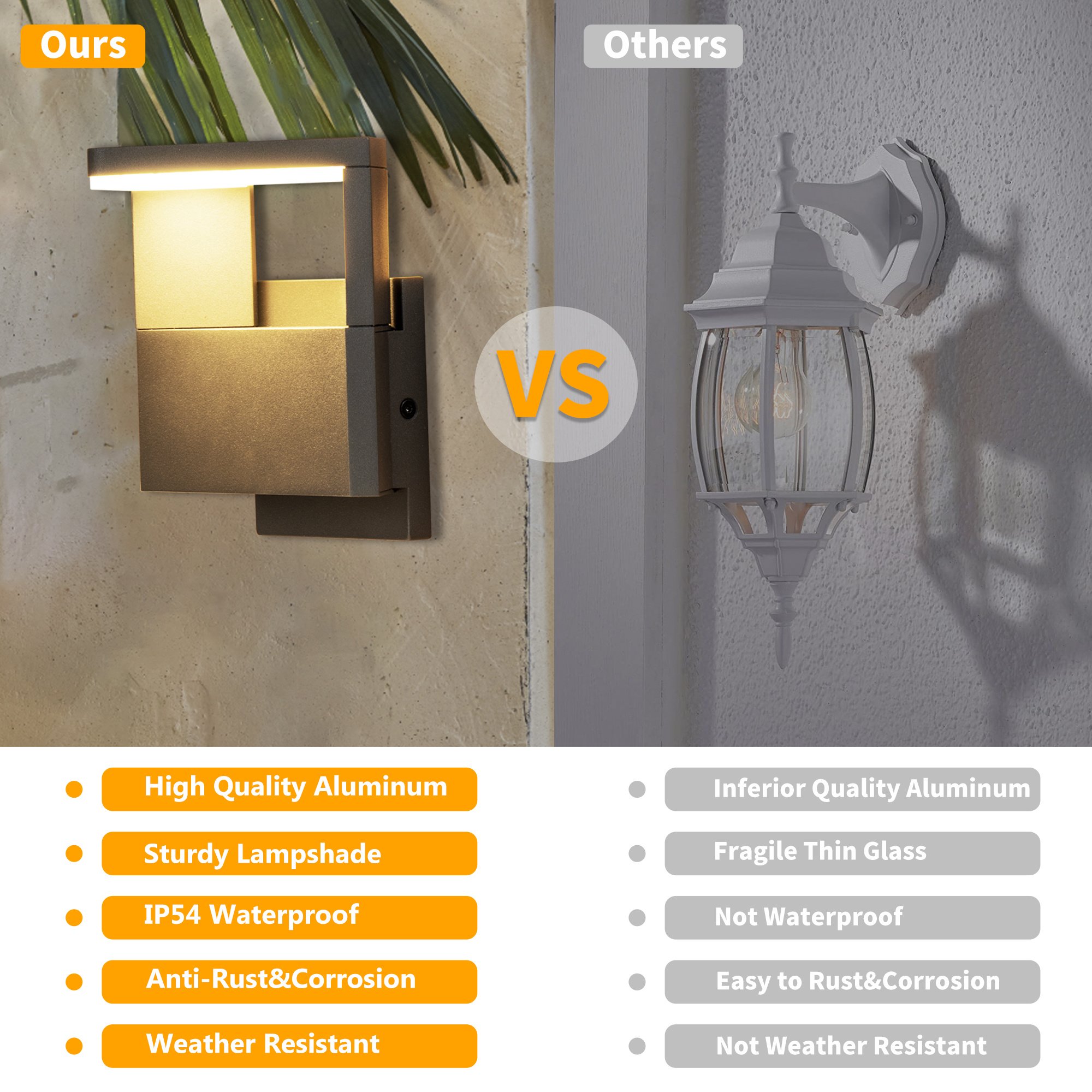 4.IP54 waterproof: all-weather resistant, wall sconces made of high quality aluminum, so anti-rust & corrosion. Never worry about rain, storm, sleet, snow, ultra high or low temperatures, this light fixture will still perfect after years of using.
