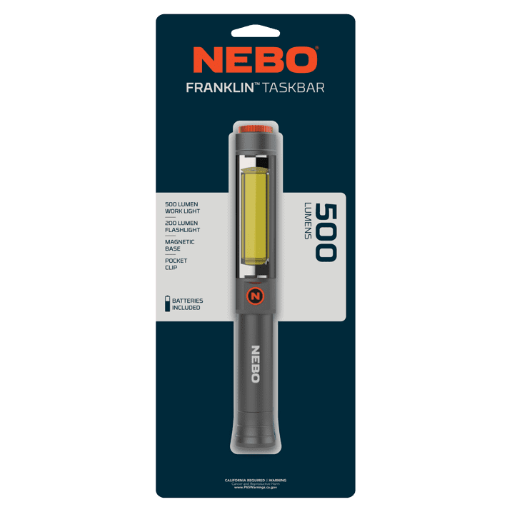 The NEBO Franklin Taskbar 500 Lumen COB LED Gray Handheld Flashlight and Work Light has seven light modes, a direct-to-red feature, and power memory recall. The red COB light can shine up to 75 meters away, making it perfect for distress signaling or roadside emergencies. The anodized aircraft-grade aluminum casing is water and impact-resistant, making this light basically indestructible. The NEBO Franklin Taskbar features a steel clip and magnetic base for convenient, hands-free lighting. Powered by 3 included AA alkaline batteries.