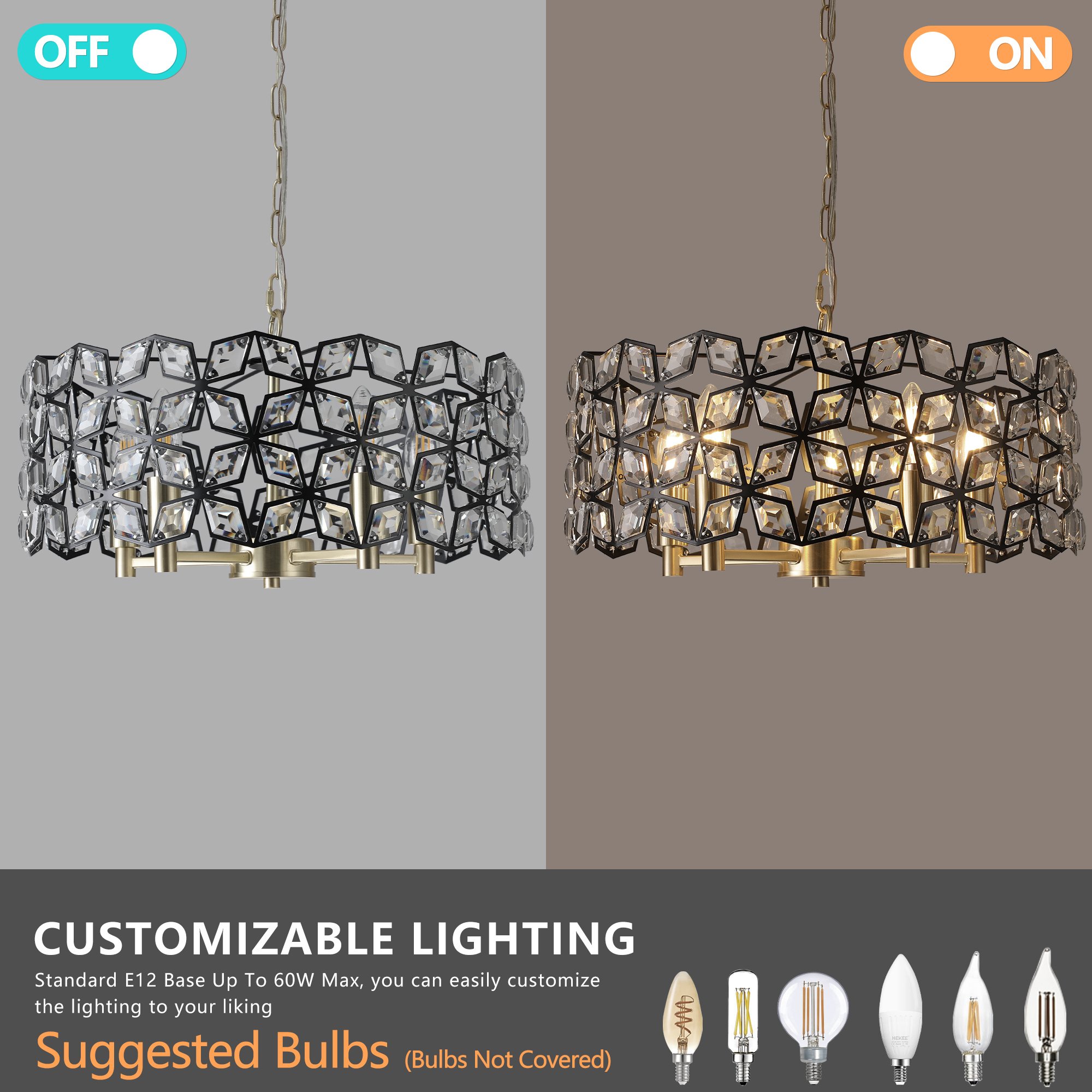Modern Crystal Chandelier for Living-Room Round Cristal Lamp Luxury Home Decor Light FixtureAbout this item-Modern crystal fashion chandelier is the best decoration in your home, showing your noble quality.Pendant Lights with long life, low energy consumption, high color, energy saving, creating green home create a different modern and simple style in your room , very elegant and eye-catching. Simple and elegant ceiling lamp suitable for kid's room, Living room, bedroom, study, dining room, bars,clubs, wedding, etc Interior lighting and Any place where you need romantic warm lights.(Composed of stainless steel and K9 crystal.The hanging chain with a 39 -inch suspension can adjust the height according to your layer height.It needs 4 E26, 60 -watt candlelight bulb.This product does not contain a light source)