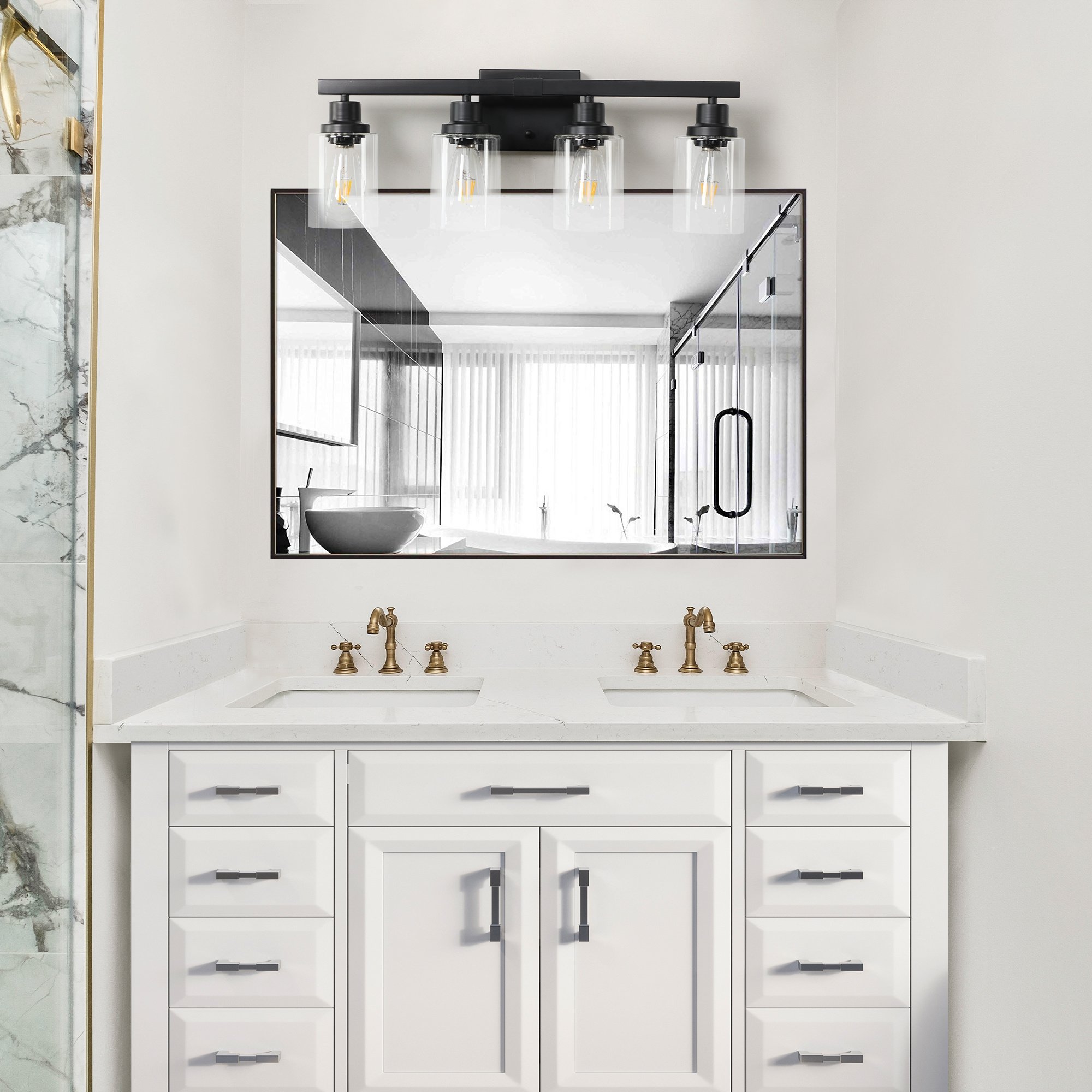4-Lights Farmhouse Vanity Lights Fixture Rustic Bathroom Light Fixture Bathroom SconceMaterial:Iron & GlassColor: BlackBulb type & quantity: 4*E26 bulbs (The product without bulbs!)Applicable space: Bathroom, Dressing room, etcInstallation mode: Wall hangingPower Supply Mode:Hard-WiredWattage: Each bulb max 60WVoltage: 110-120VSize: Please look at the "Product Dimensions" column or refer to the product picture