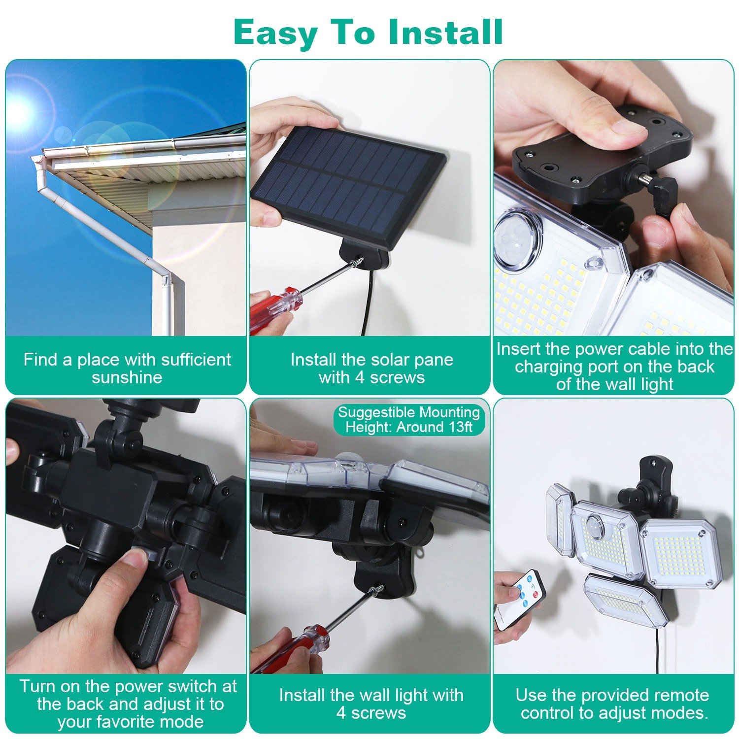 *4 Adjustable Heads & Separate Solar Panel*:The 4 adjustable heads can move up,down or horizontally,which allows you to light any angle you want. The solar panel can be adjusted at will to ensure that each angle can absorb sunlight to the maximum extent. Moreover,the separate panel is equipped with 189in long cable,which enables you to install it at different angles. The sensing angle of up to 120° and the sensing distance of 118in can provide additional brightness and a larger visible area.